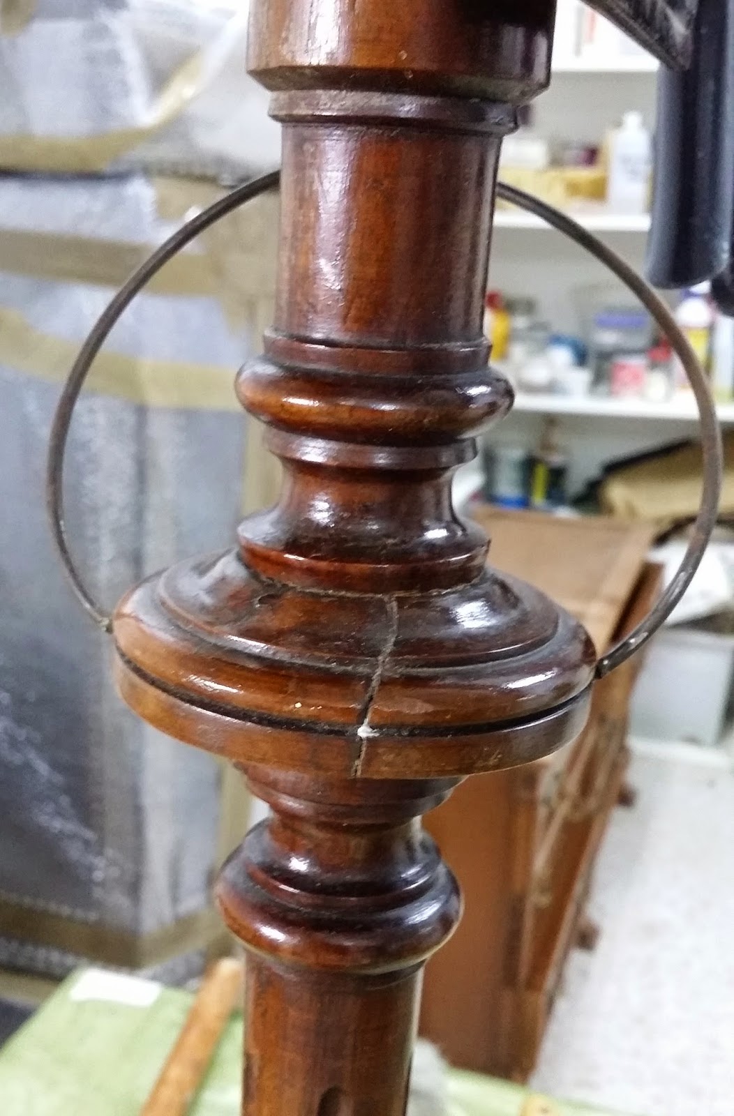 Al manipular la pieza durante la intervención me encuentro con otra fractura, esta vez en los torneados. Aparentemente parecían de una pieza, este tipo de detalles son importantes a la hora de datar y valorar una pieza. Tras este hallazgo se puede presuponer que la pieza no tiene la antigüedad que pensaba, sino que se trata más bien de una reproducción construida en serie.